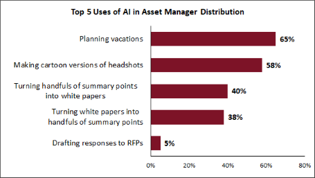 More asset managers are relying on AI in distribution, with the biggest increase in usage coming from vacation planning, which occurs at 65 percent of firms, up from 45 percent in 2024, a new